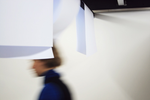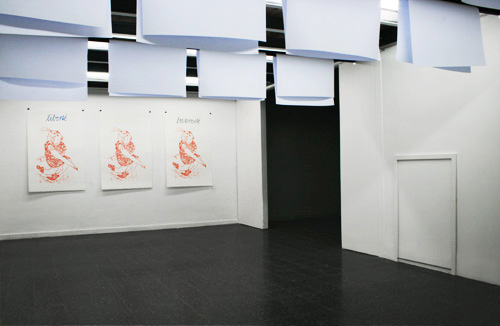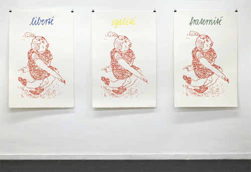 3 pairs of wooden panels, 12 white papers, 2 white wooden frames stretched with stainless steel, 3 original screen prints
