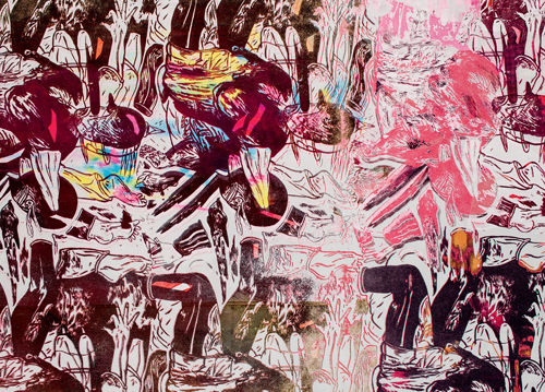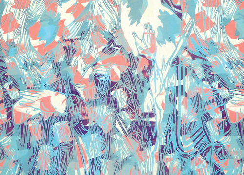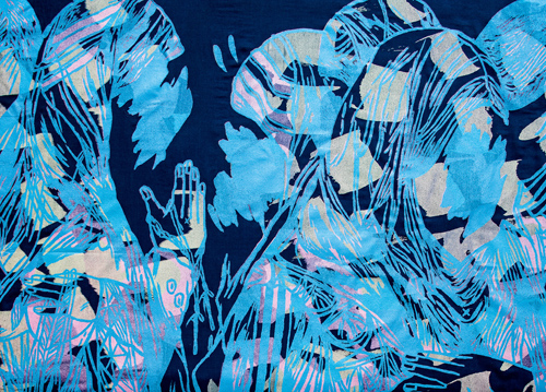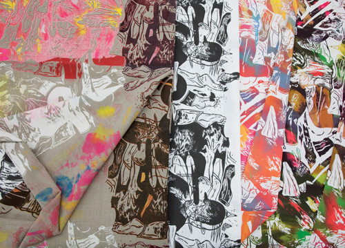Series of hand printed textiles, either as a 2 way – or 4 way repeat. The printing technique is a combination of screenprint and monoprint. The fabrics are available in different color combinations.