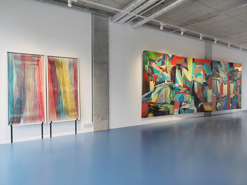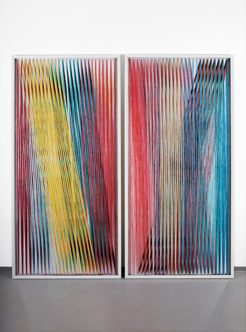 REIZLEITUNG I & II – DEINE, MEINE, KEINE! / CONDUCTION I & II – YOURS, MINE, NONE! Knitting wool in various colours from VEB Polar Karl-Marx-Stadt, former GDR, 20 mm flat rolled steel with galvanised screw hooks / Strickwolle in verschiedenen Farben von VEB Polar Karl-Marx-Stadt, ehemals DDR, 20 mm Flachstahl mit verzinkten Schraubhaken, Diptych / Diptychon, Each / Je 105×215 cm, Ivonne Dippmann, Berlin 2016