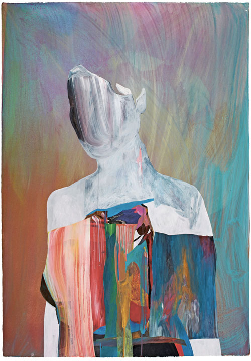 SIE WAREN ZU DRITT, EIN MÄDCHEN, EIN KNABE, UND KONNTEN DREISTIMMIG SINGEN. / THERE WERE THREE OF THEM, A GIRL, A BOY, AND THEY COULD SING IN THREE PARTS. Acryl, Tusche, Sprühfarbe, Gouache auf Kupferkarton, 100×80 cm, Ivonne Dippmann, Berlin 2016, private collection Berlin
