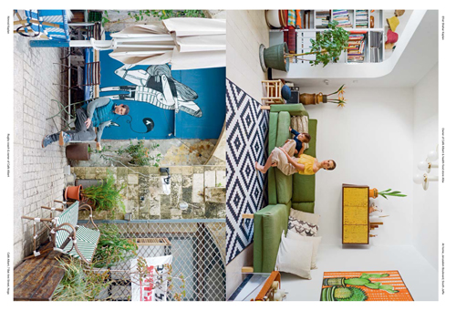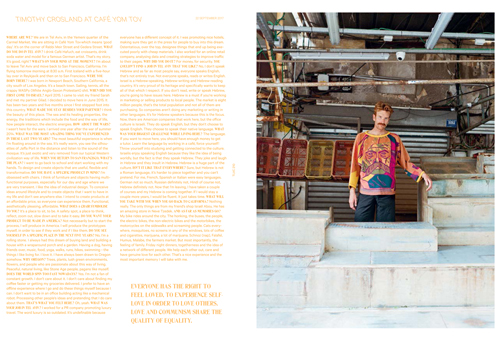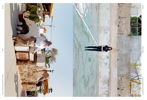 Double spreads — We are many with Philipp Gladsome and Tanja Rochow, Tel Aviv 2016-2018 (Luca Lombardi at Perez Center for Peace, Arnon Naor at beachfront Jaffa port, Efrat Shahar Kaplan at home, Nimi Kaplan at Albert Cafe, Tzlil Danin at Rabi Khanina St, Jaffa, Ilana Goor at her rooftop garden at home.