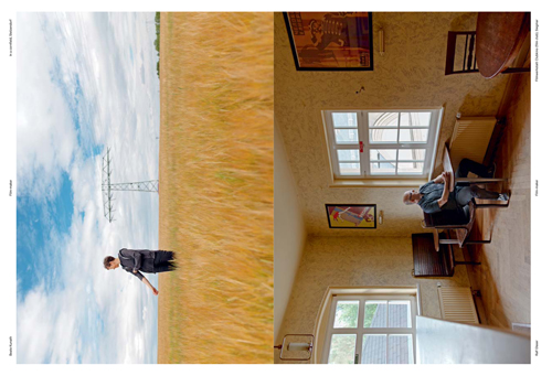 Double spreads — Dem Gesicht einen Schritt voraus with Philipp Gladsome and Yvonne preibisch, Chemnitz 2016-2018 (Yvonne Preibisch at home, Felix Schubert at rooftop Weltecho, Robert Reinhold at Südbahnhof, Beate Kunath in a cornfield in Stelzendorf, Olaf Held at Clubkino Siegmar)