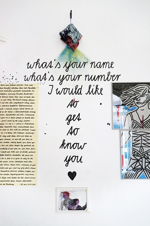 What’s your name, what’s your number, I would like to get to know you, 305 × 832 cm, Collage, Acryl, Tusche, Gouache, Glanzlack, Karton, Messing, Textil auf Wand, Textildesign FriedrichDippmann, Hamburg 2017